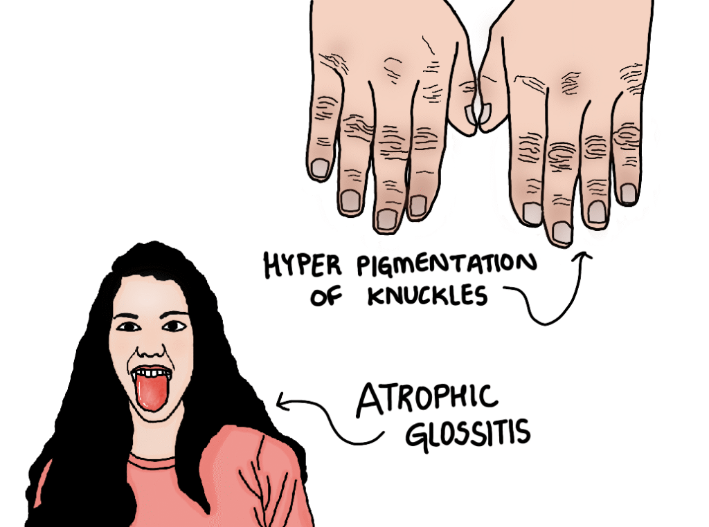 Fatigue, palour, hyperpigmentation of knuckles and atrophic glossitis can be seen. Atrophic glossitis is characterized by smooth, shiny, beefy red tongue.