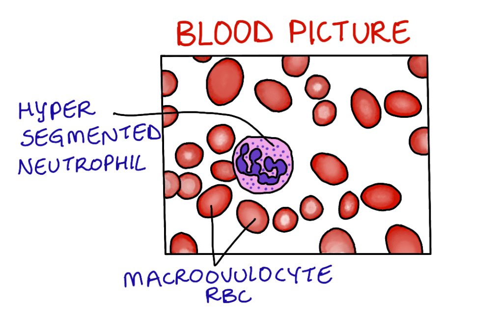 Blood picture shows pancytopenia. Macroovulocyte RBCs and hyper segmented neutrophils are same. Bone marrow is hypercellular.